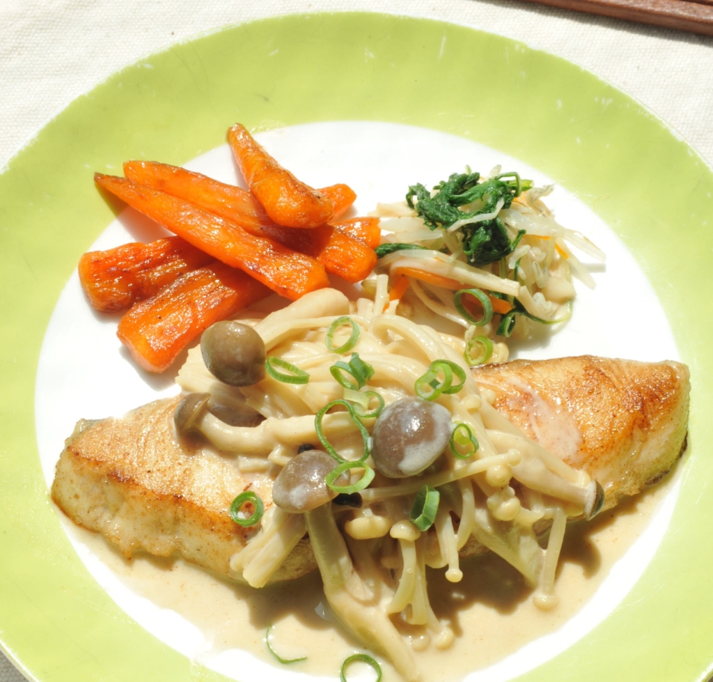 ①きのこはほぐす。サワラは塩(分量外)を振る。
